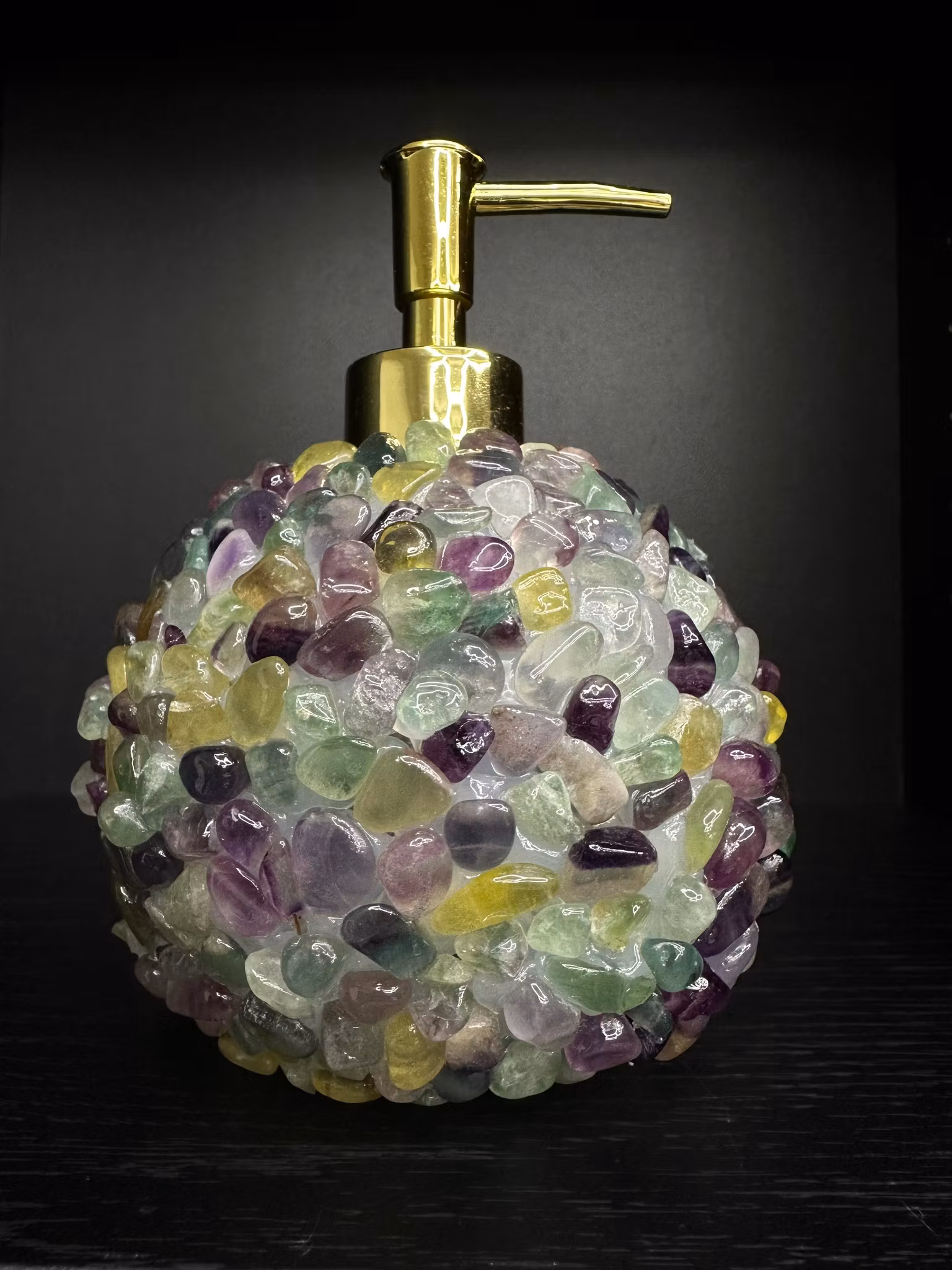 Guldig tvålpump med naturliga fluoritkristaller – en stilren och unik detalj för badrum eller kök. 💚✨