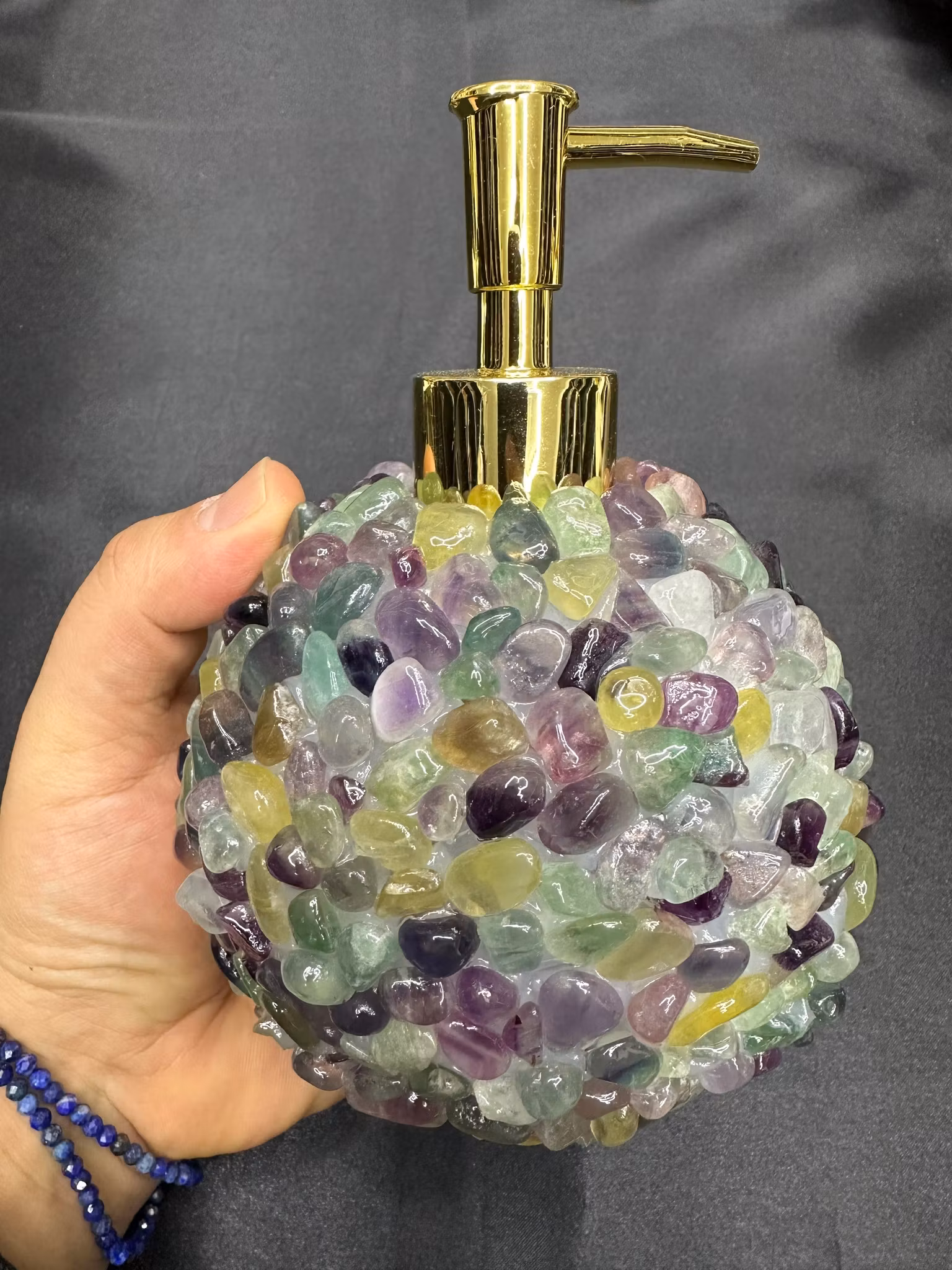 • Material: Naturlig fluorit & guldfärgad pump