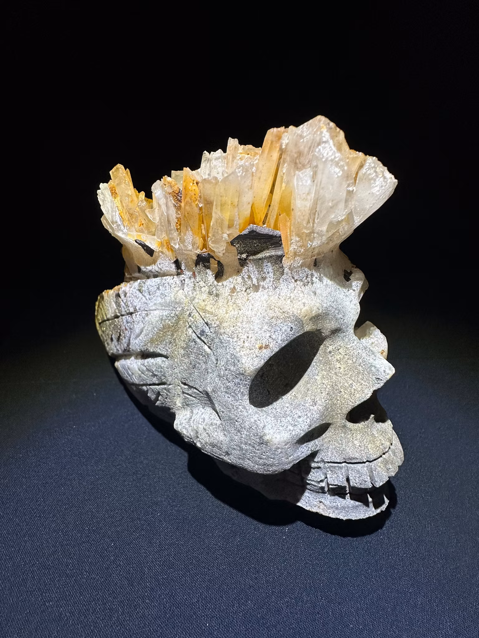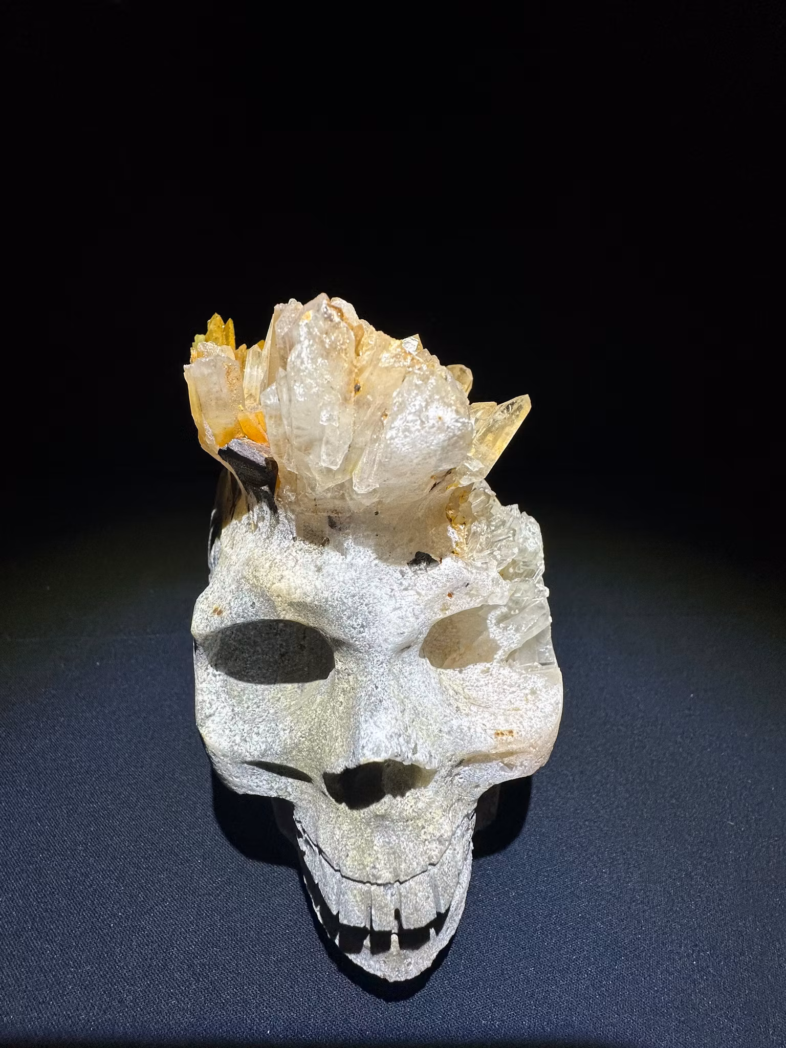 Detta unika konstverk är handgjort i Burma och består av en naturlig kvartskluster där glittrande pyrit harmoniskt förenas med en detaljrik dödskalle – symbol för visdom, transformation och evig energi.