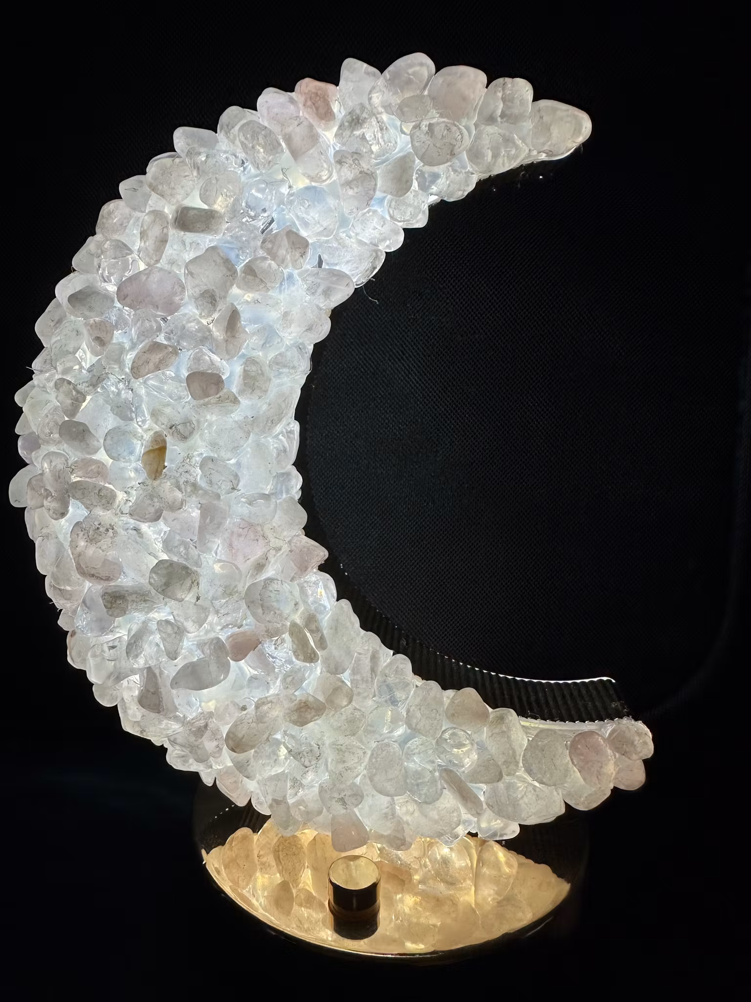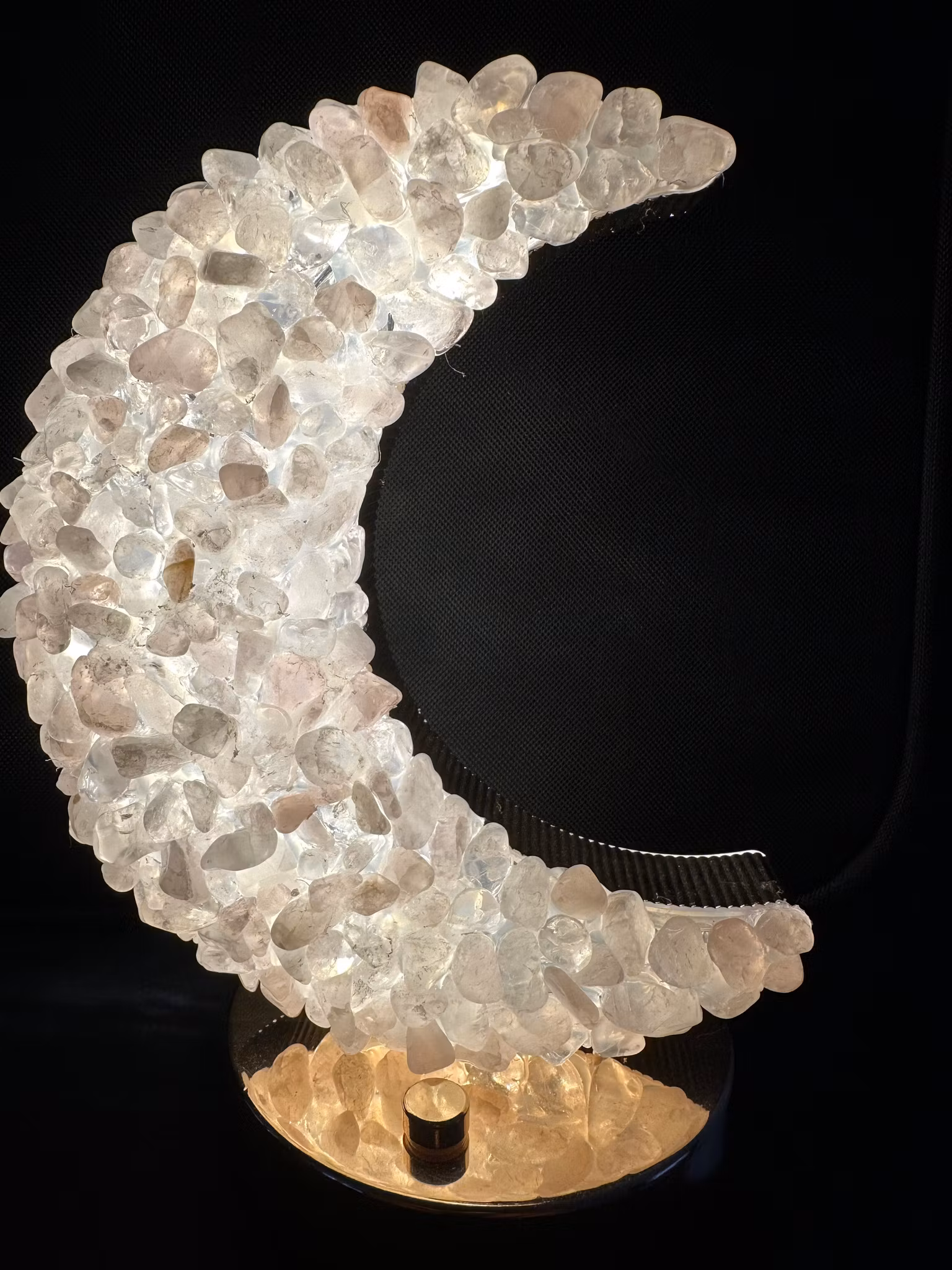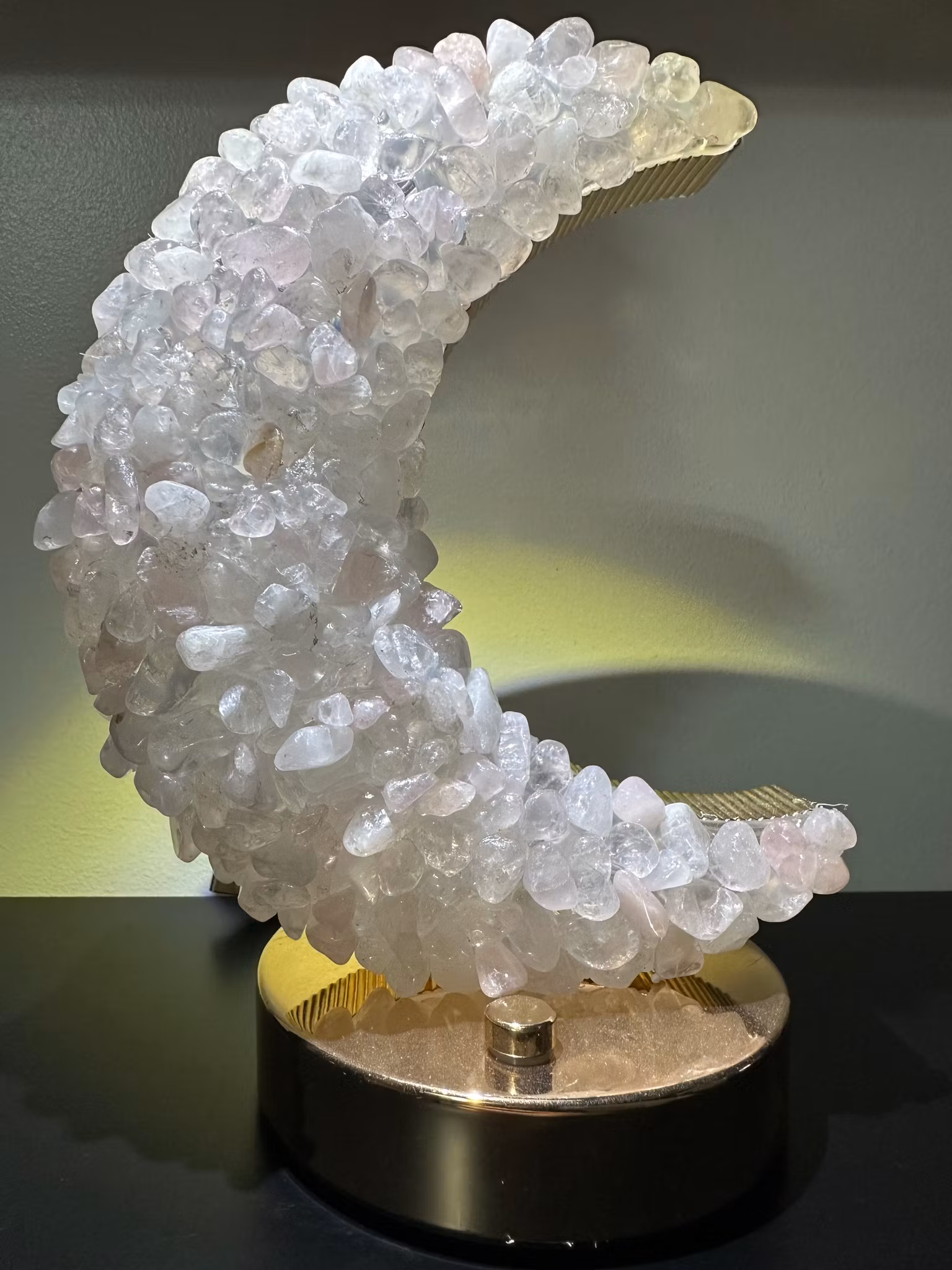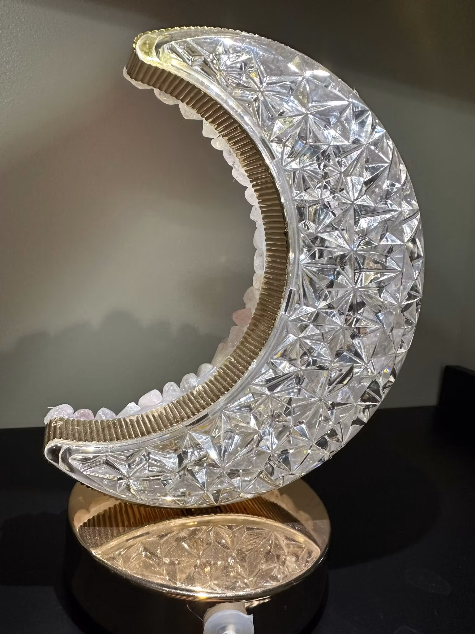 Elegant design möter mjukt skenMed sin naturliga Rosenkvarts Kristall och 3D-design (måne) är en lampa för både vardag och speciella tillfällen – lika uppskatta