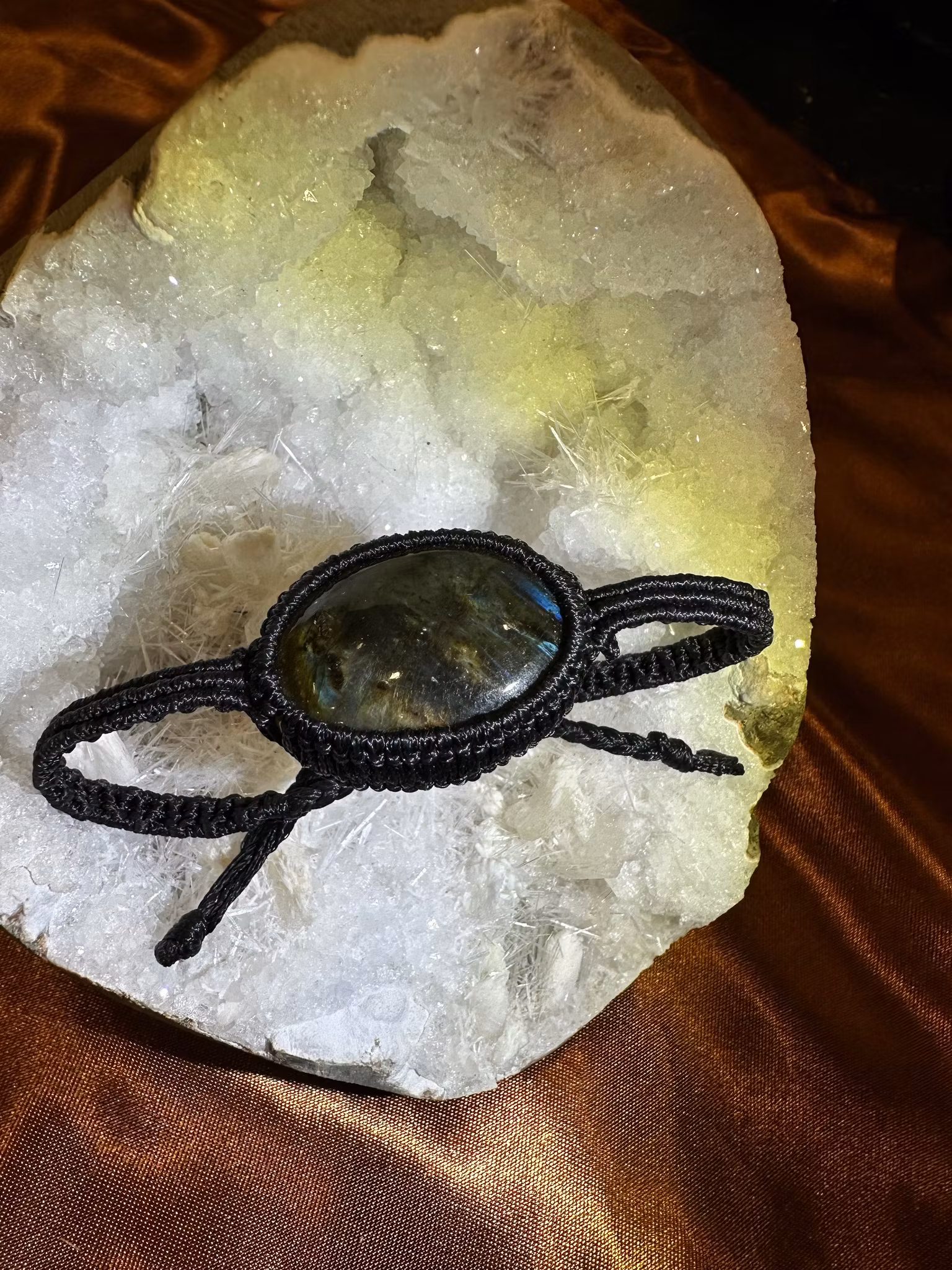 Armbandet är justerbart och passar bekvämt runt de flesta handleder, vilket gör det både praktiskt och tidlöst. Kombinationen av det handgjorda makraméarbetet och labradoritens naturliga skönhet ger ett smycke som känns både jordnära och magiskt.