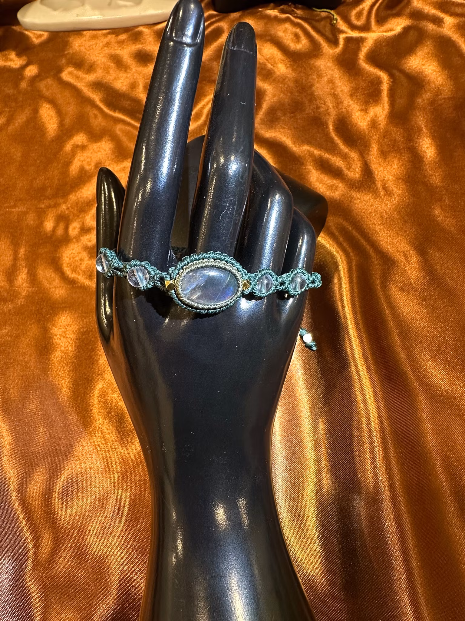 Detta justerbara makraméarmband är skapat genom traditionellt hantverk, där varje knut formas för hand med omtanke, tålamod och känsla. I centrum finner du naturlig labradorit – stenen som skimrar i blå och gröna toner och bär ett mystiskt ljus som påminner om norrskenets energi.