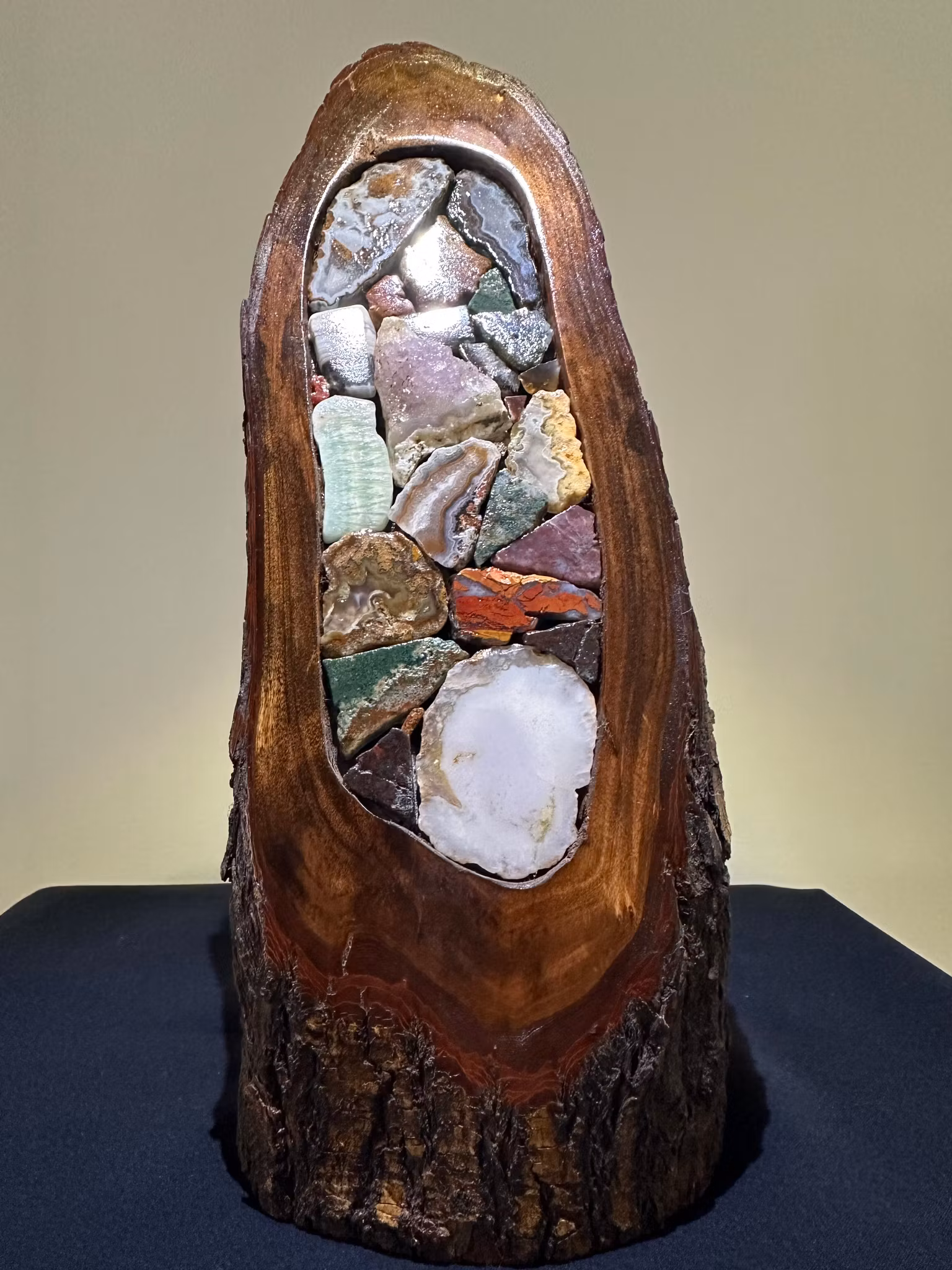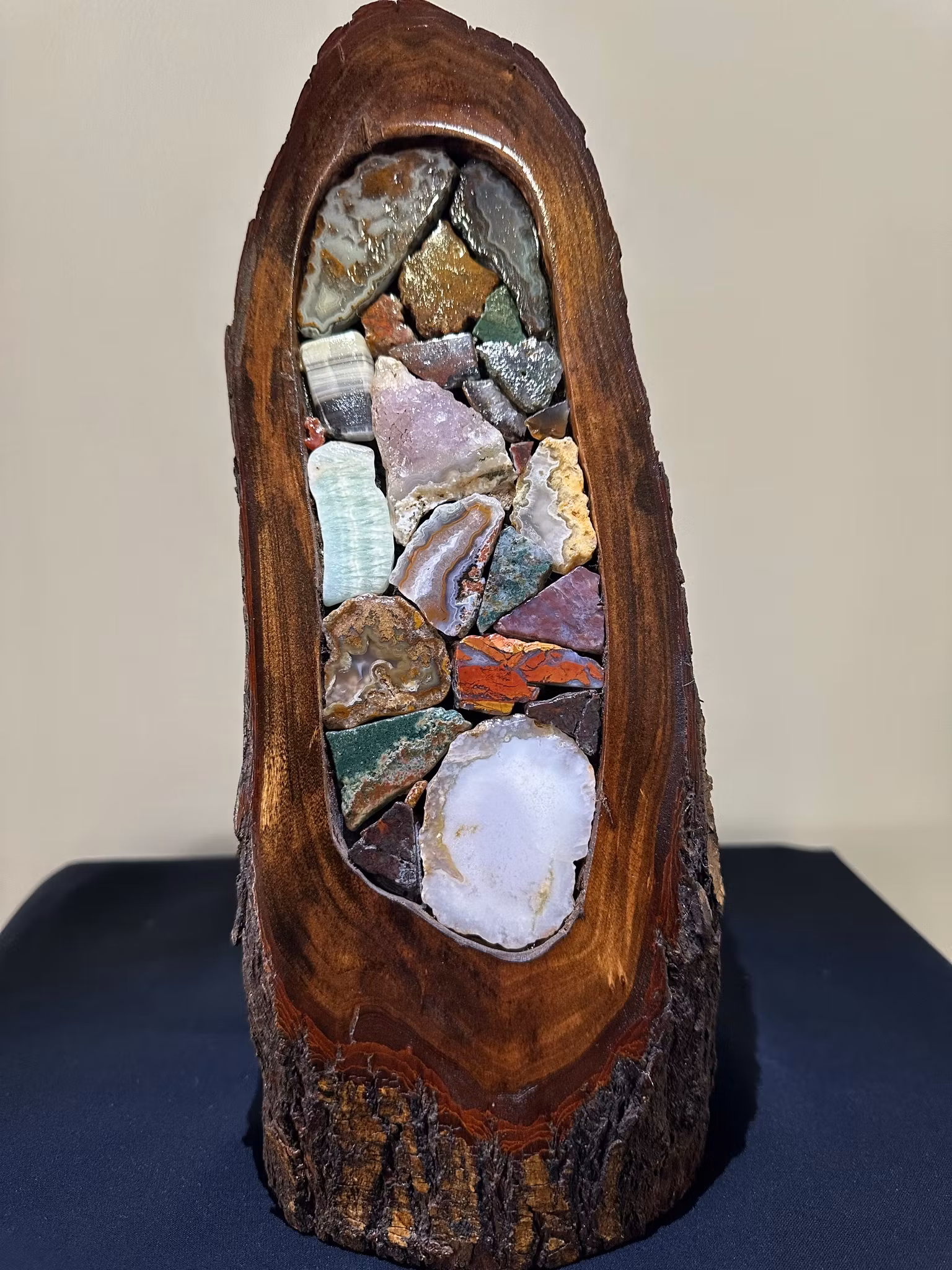 Kristalltavla i Jaspis, Agat & Ametist på trädstock