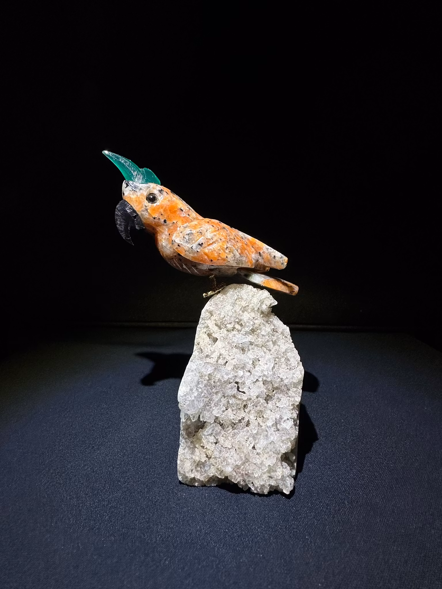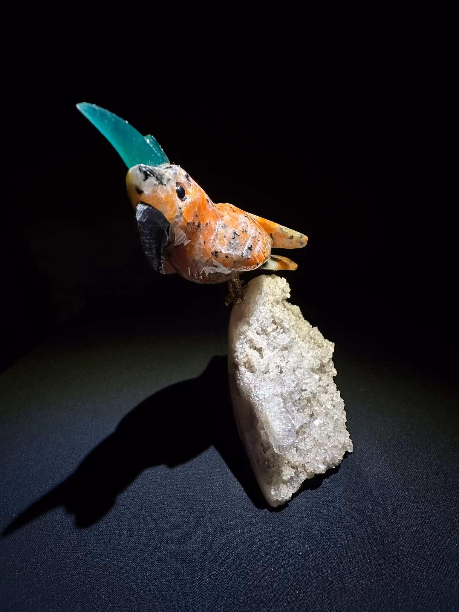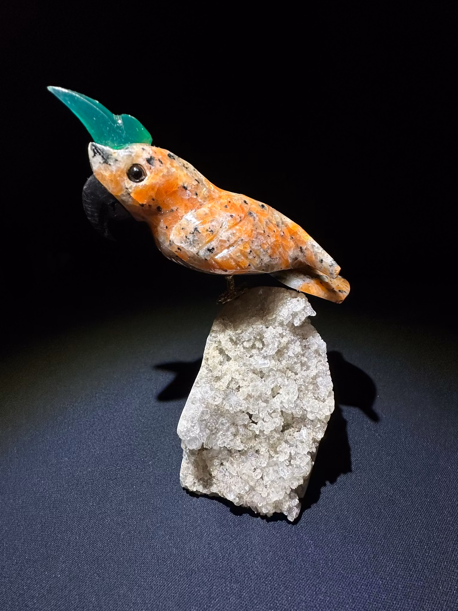 Naturlig Handgjord papegoja i Agat & Fluorit placerat på klara stående Ametist kluster 💎Unik och naturlig handgjord papegoja skulpterad i orang Jaspis Agat,