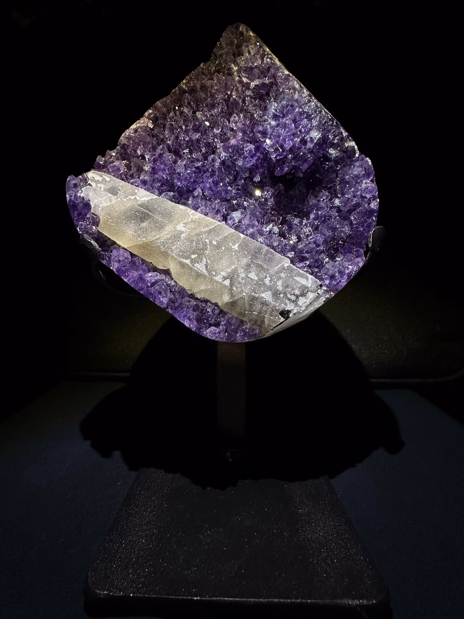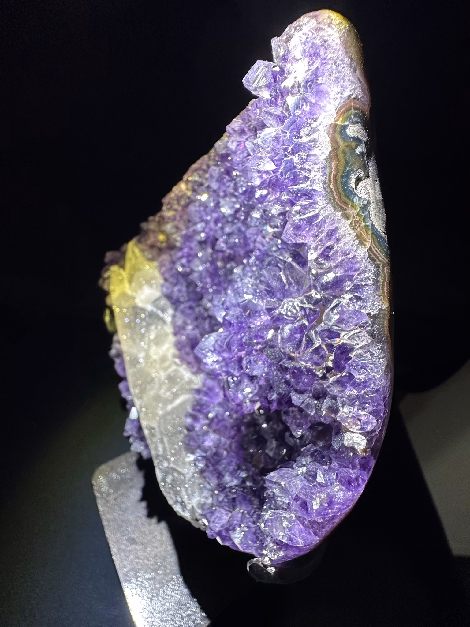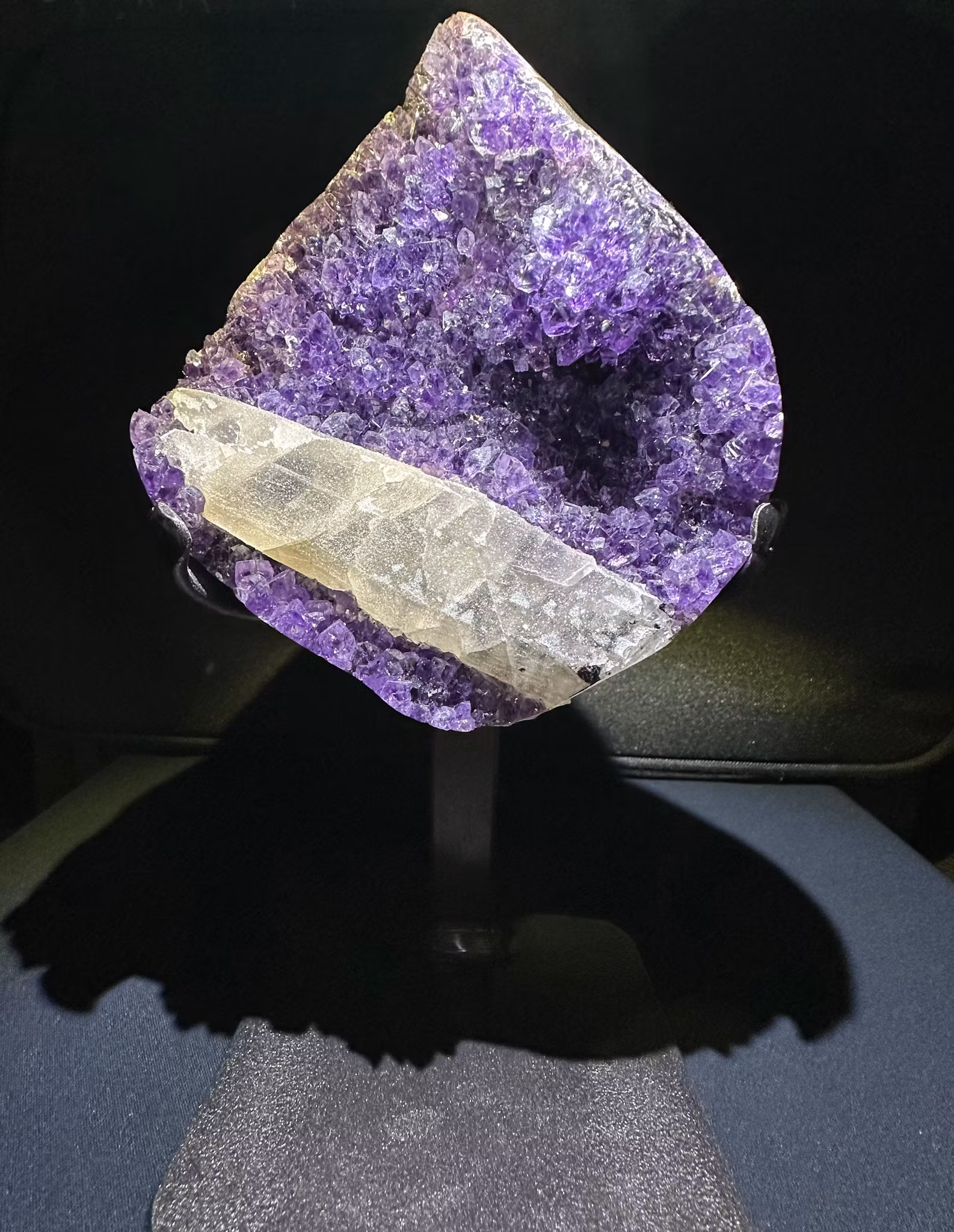 En otroligt vackert Ametist kluster på stativ och vackra spetsar som både är klara och gnistrar & druzy kalcit som bildade sig på kristallen.