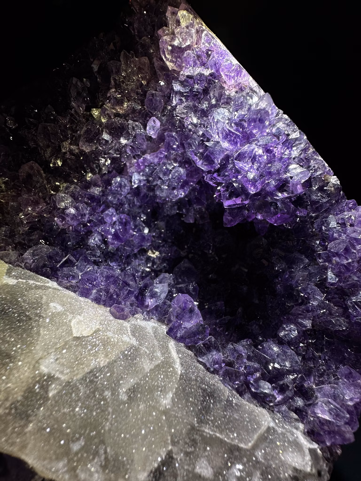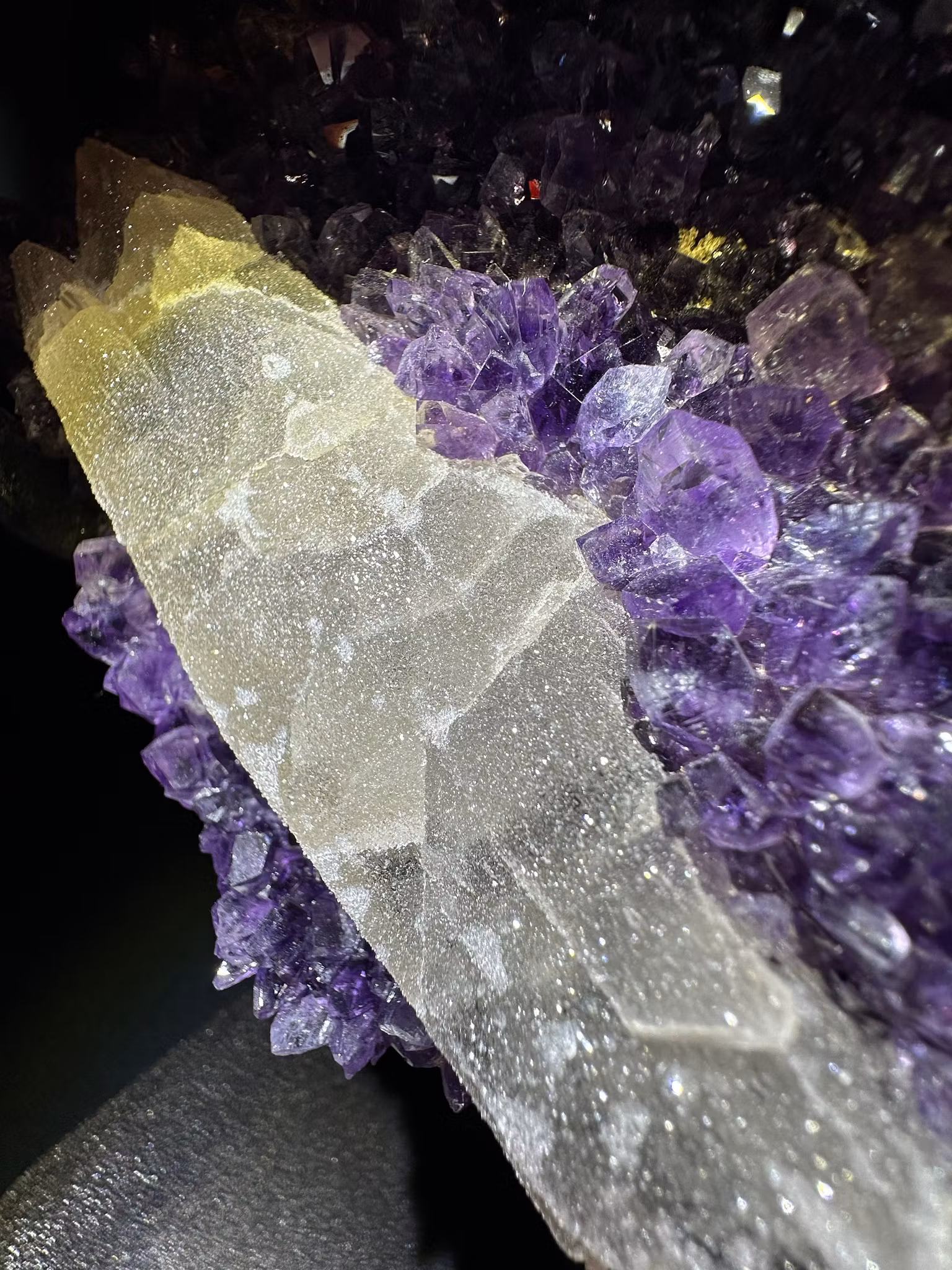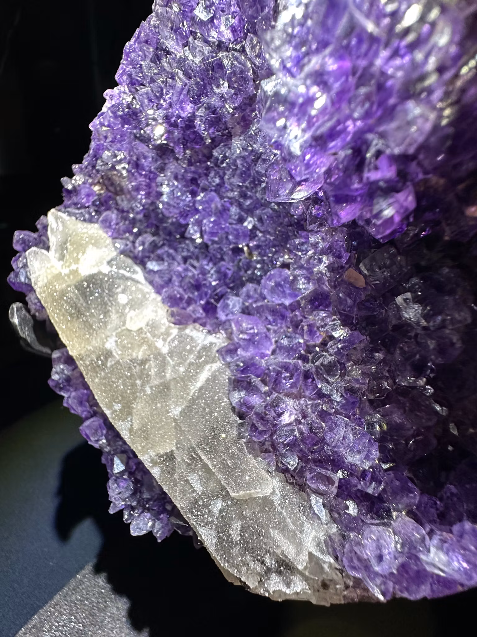 En otroligt vackert Ametist kluster på stativ och vackra spetsar som både är klara och gnistrar & druzy kalcit som bildade sig på kristallen.