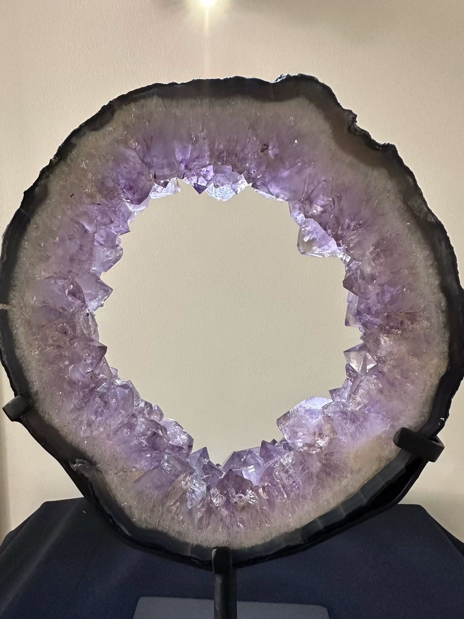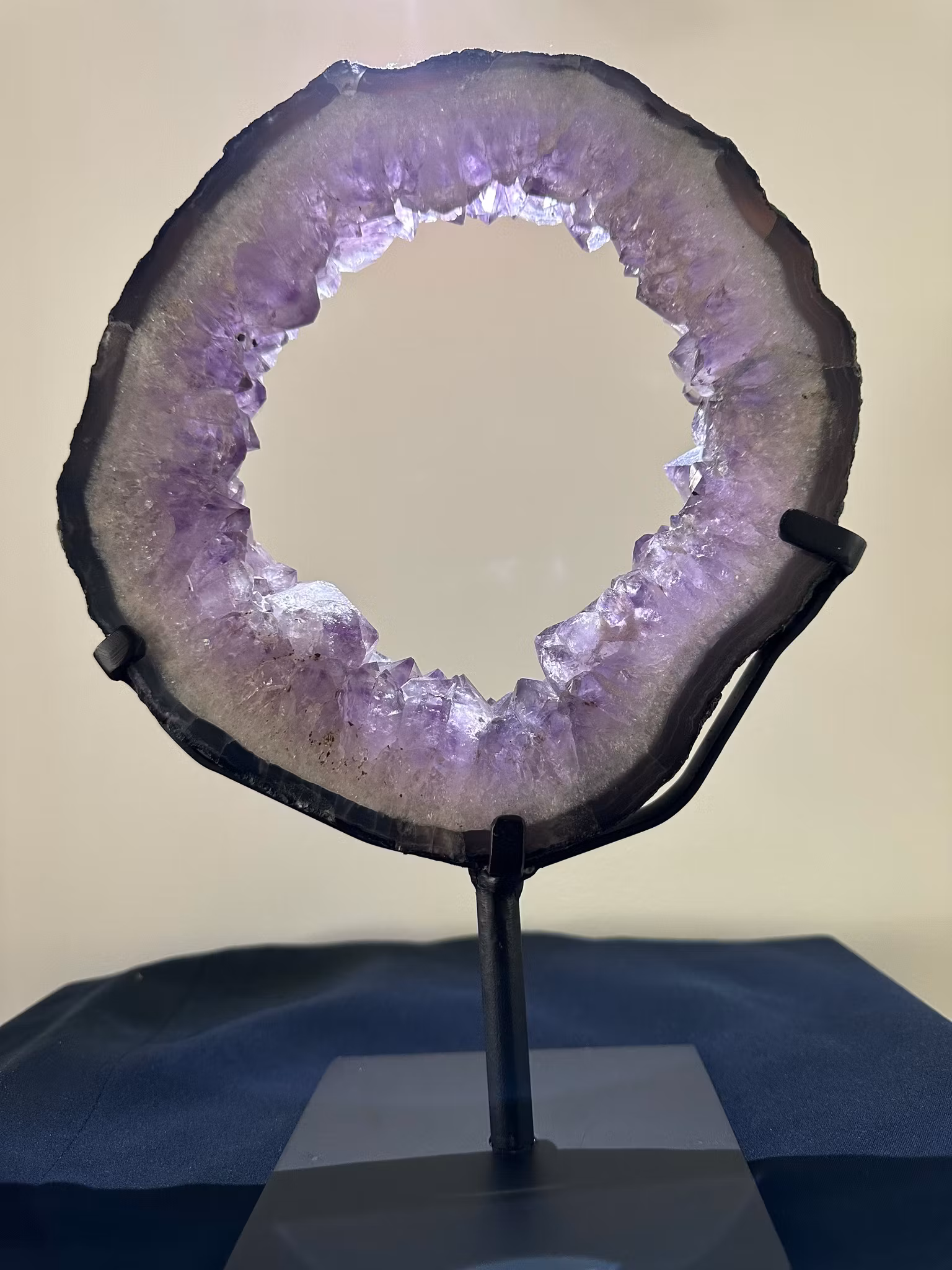 Naturlig lila Ametistportal på standExklusiv Ametistportal i naturligt lila kristall, monterad på stand. Den vackra kristallstrukturen och djupa färgen gör den