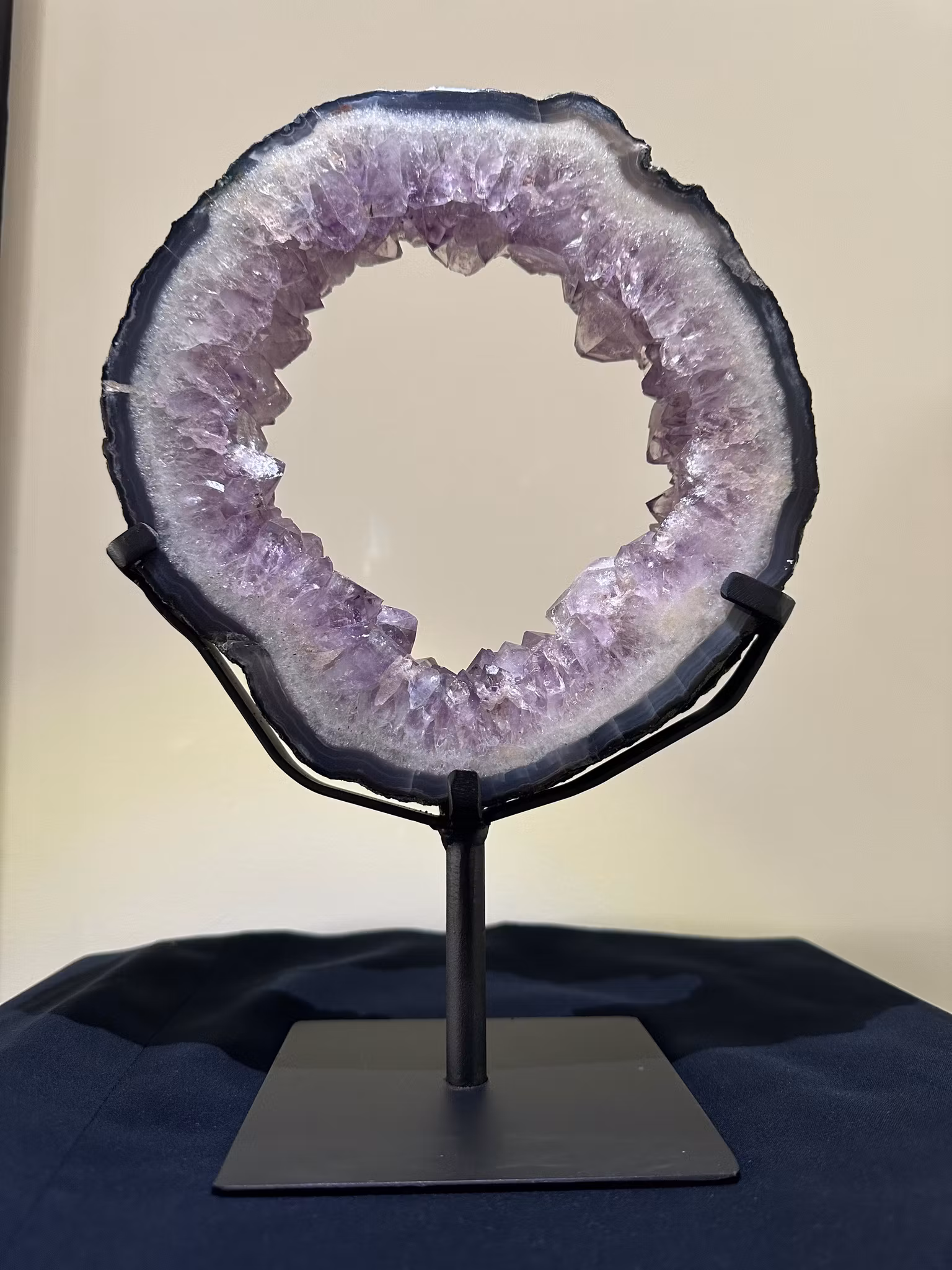 Exklusiv Ametistportal i naturligt lila kristall, monterad på stand. Den vackra kristallstrukturen och djupa färgen gör den till ett unikt blickfång och en harmonisk inredningsdetalj i hem eller kontor.