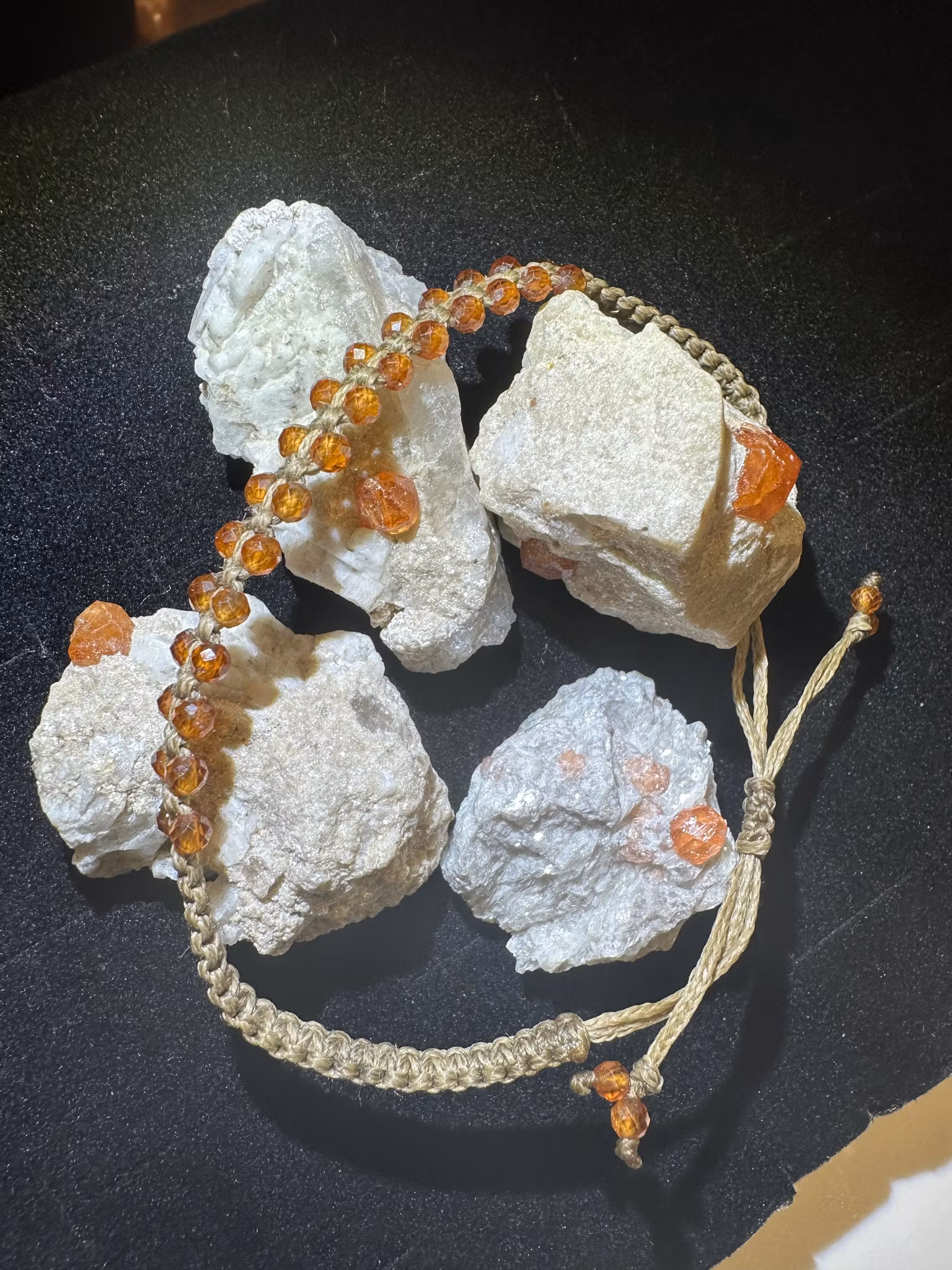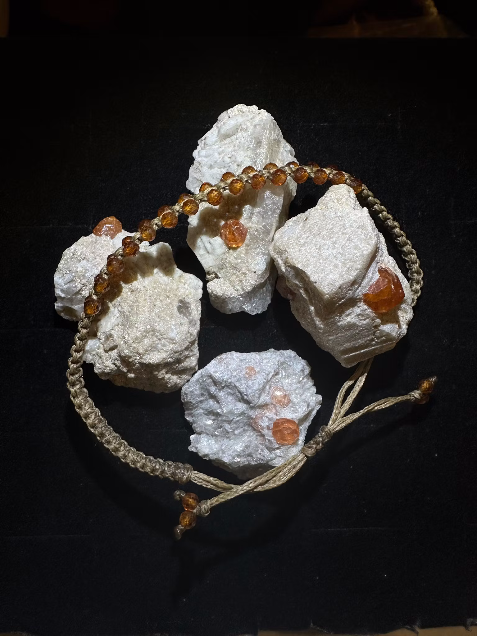 Hessonit Granat är känd för sin jordnära energi och förmåga att stärka motivation, vitalitet och självförtroende. Armbandet kombinerar stenens kraftfulla egenskaper med det tidlösa hantverket i makramé, vilket gör det både vackert och meningsfullt att bära.