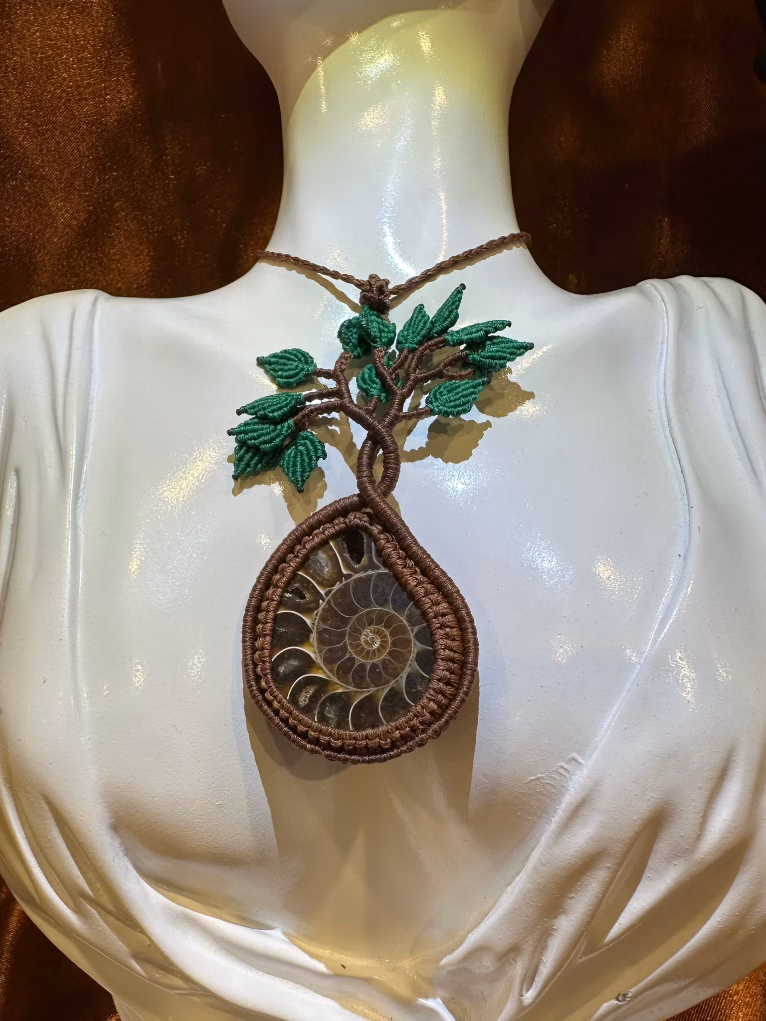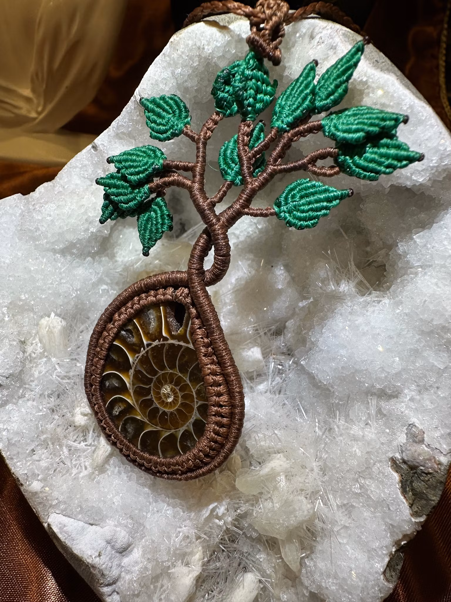Detta handgjorda makraméhalsband är skapat med traditionellt hantverk, där varje knut formas med omsorg och precision. I centrum sitter en unik ammonitfossil so