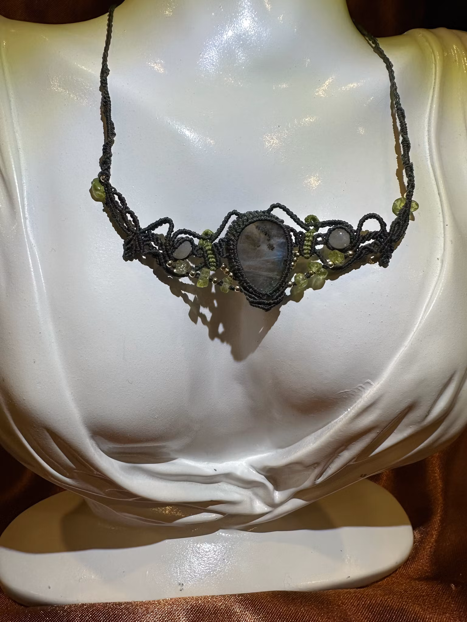Detta handgjorda makraméhalsband är skapat enligt traditionellt hantverk, där varje knut formas med tålamod och precision. I centrum sitter en naturlig labradorit – en sten som skimrar i blå och gröna nyanser och fångar ljuset som ett stilla norrsken. Den magiska labradoriten kompletteras av naturliga gröna peridoter och klara kvartskristaller, noggrant designade för att förstärka halsbandets energi och uttryck.