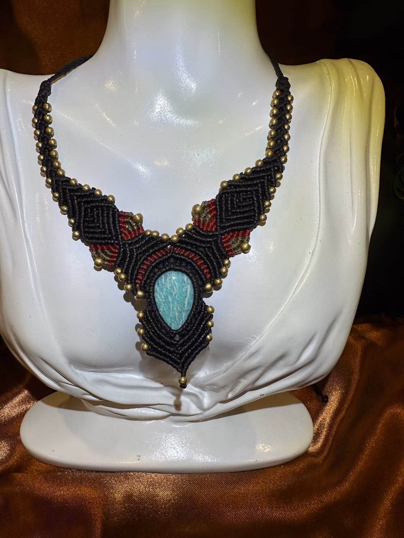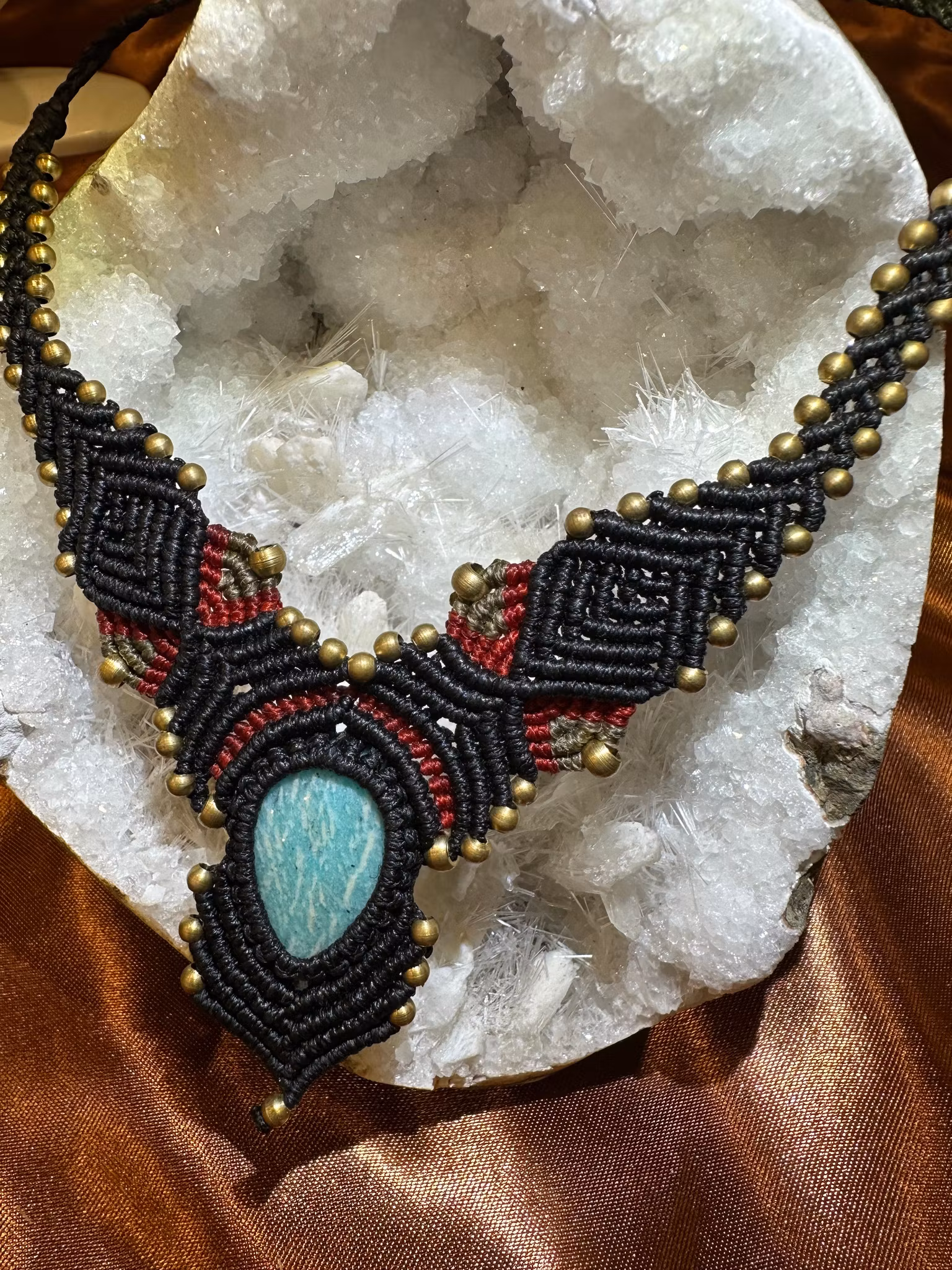 Detta handgjorda makraméhalsband är skapat med traditionellt hantverk, där varje knut formas med omsorg och precision. I centrum sitter en naturlig amazonit – e