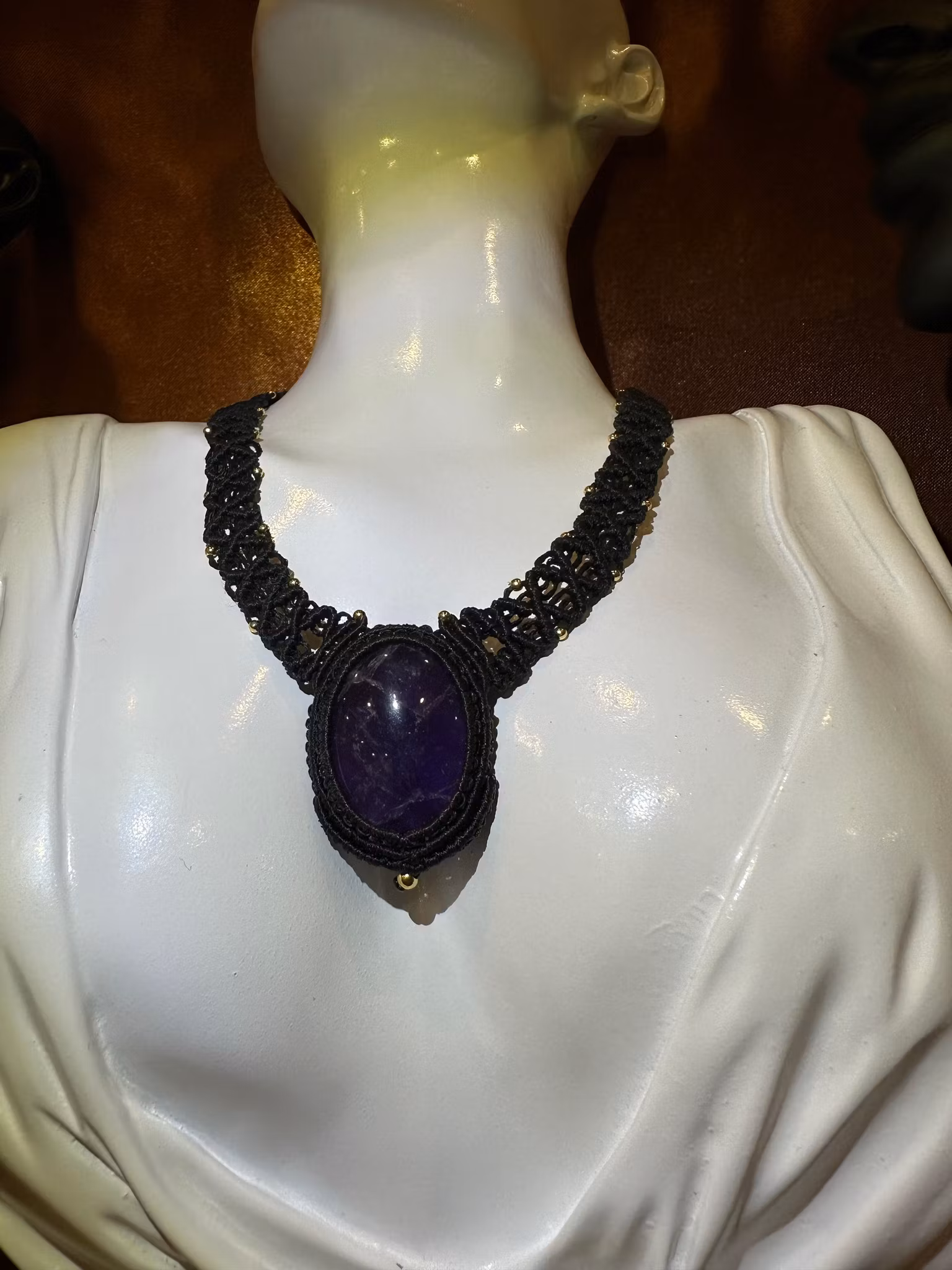Detta handgjorda makraméhalsband är skapat med traditionellt hantverk, där varje knut formas med omsorg och precision. I centrum sitter en naturlig ametist – en lila kristall som utstrålar lugn, balans och spirituell energi.