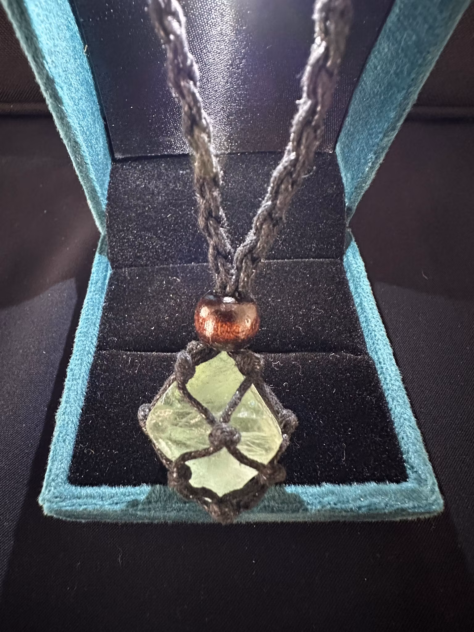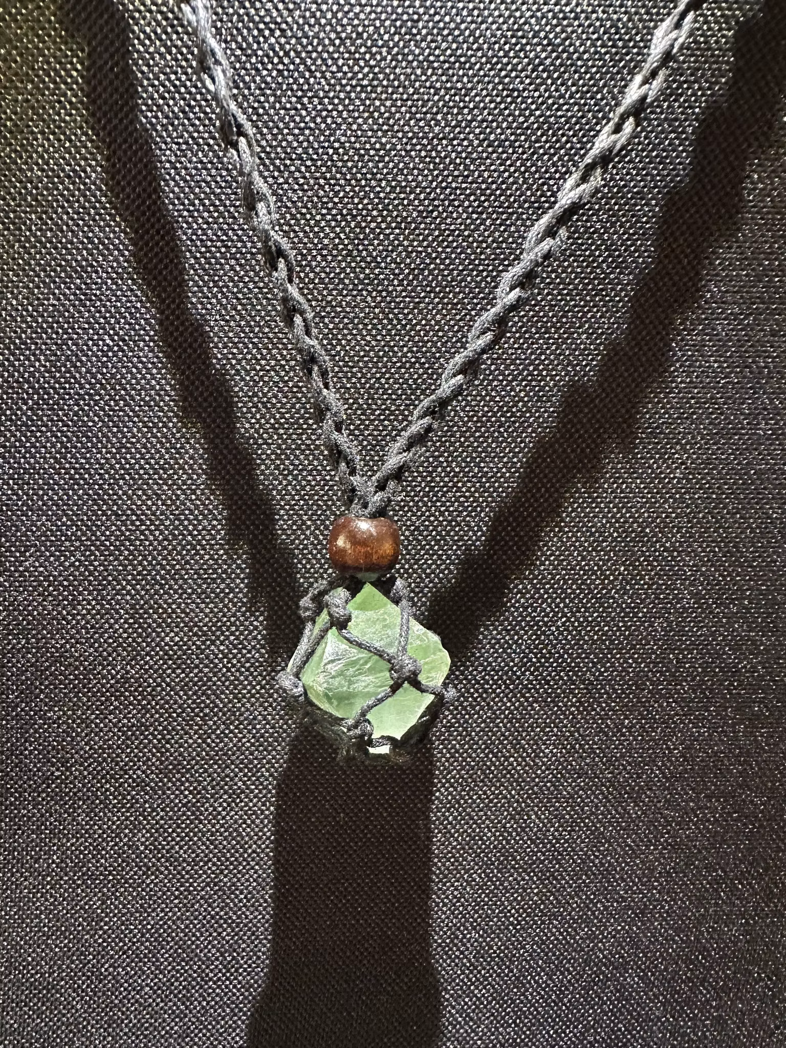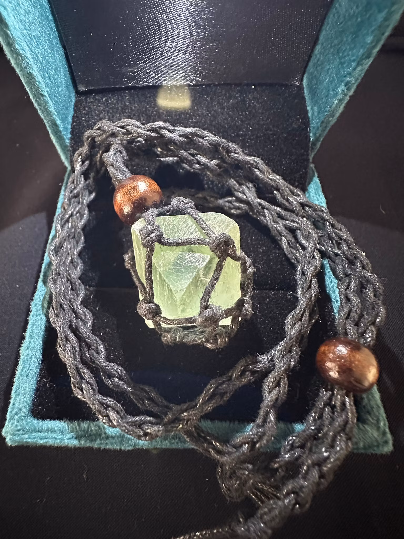Vacker kub av Naturlig Grön Fluorit Hänge i Makramépåse som halsband av vaxad bomullstråd och två träpärlor med vars hjälp du låser påsen eller förkortar halsba