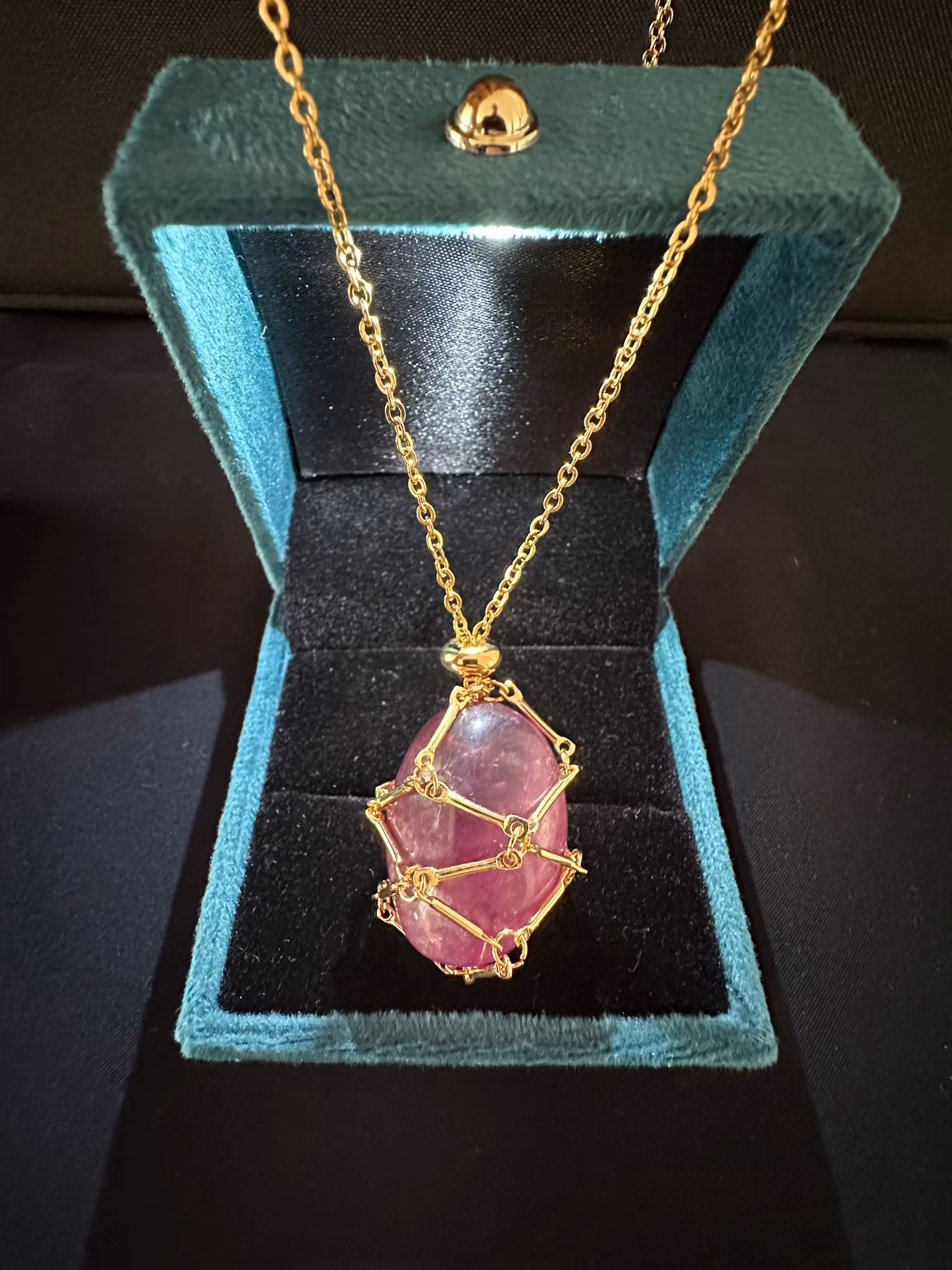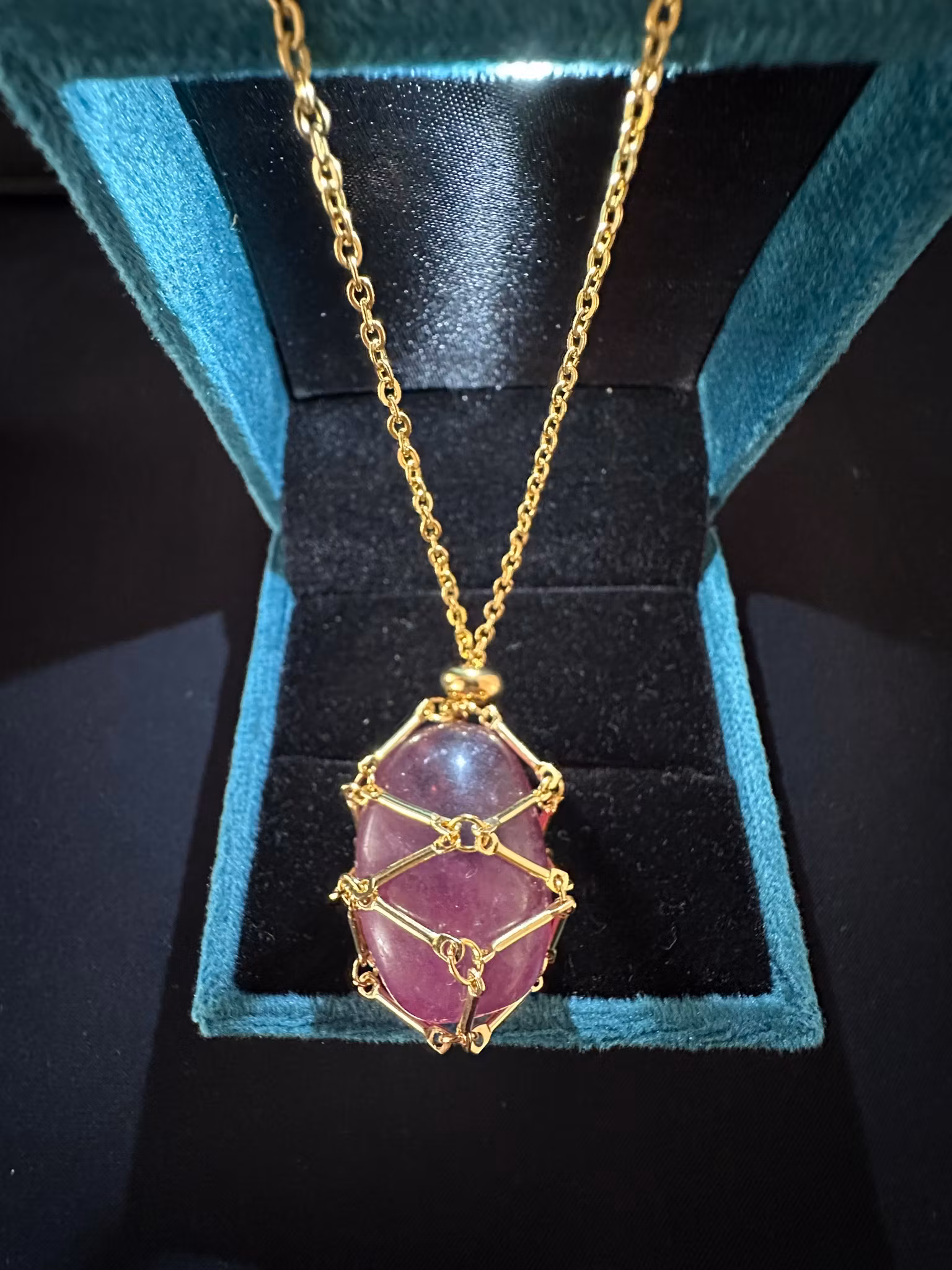 Naturlig & unik Lila Fluorit Hänge i Makramépåse guldpläterad halsband.Inom smyckestillverkning används fluorit ibland för att skapa unika och färggla