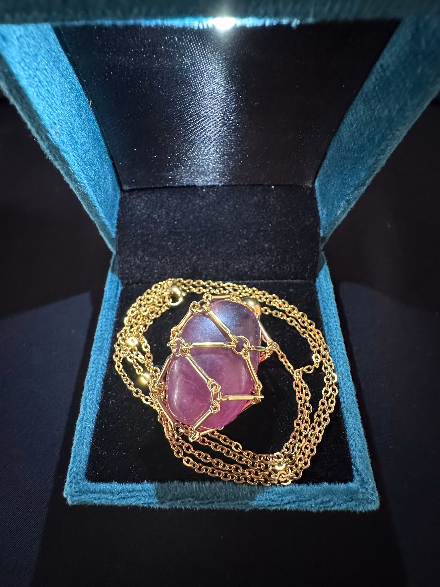 Naturlig & unik Lila Fluorit Hänge i Makramépåse guldpläterad halsband.