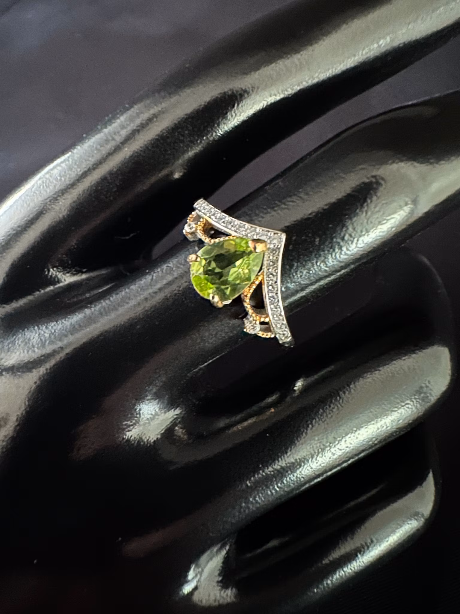 Stilfull Ring i äkta 925 sterling silver, smyckad med en naturlig peridot i elegant droppformat snitt och dekorerad med gnistrande zirkoner. Ringen är justerbar i storlek och kombinerar klassisk design med stenarnas naturliga kraft.