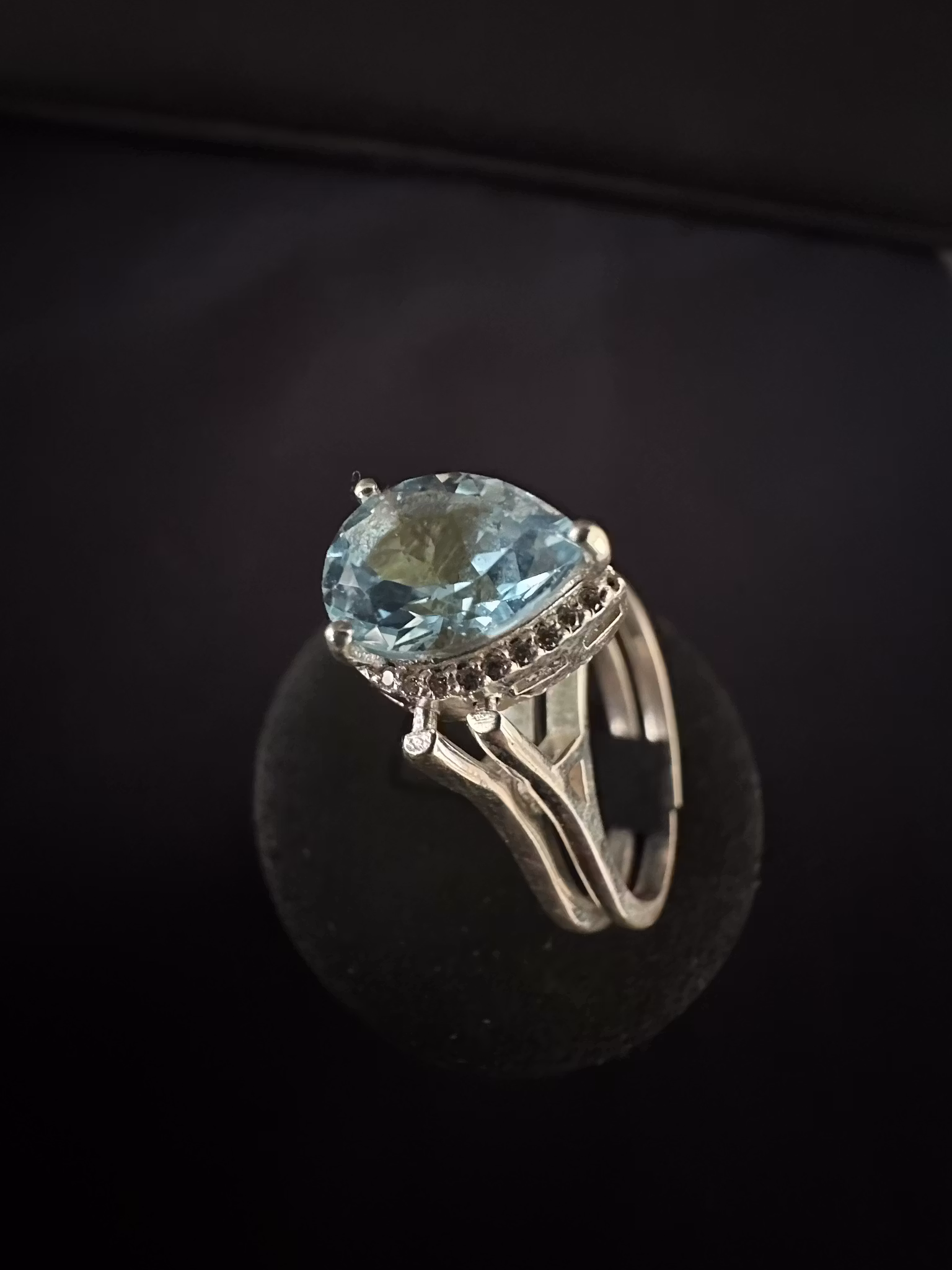 Ringen är dubbelsidig och vändbar, vilket gör att du kan bära två olika uttryck i ett smycke – den klara, ljusblå topasen som symboliserar sanning, lugn och kreativitet, och den friska gröna peridoten som står för harmoni, livskraft och balans.