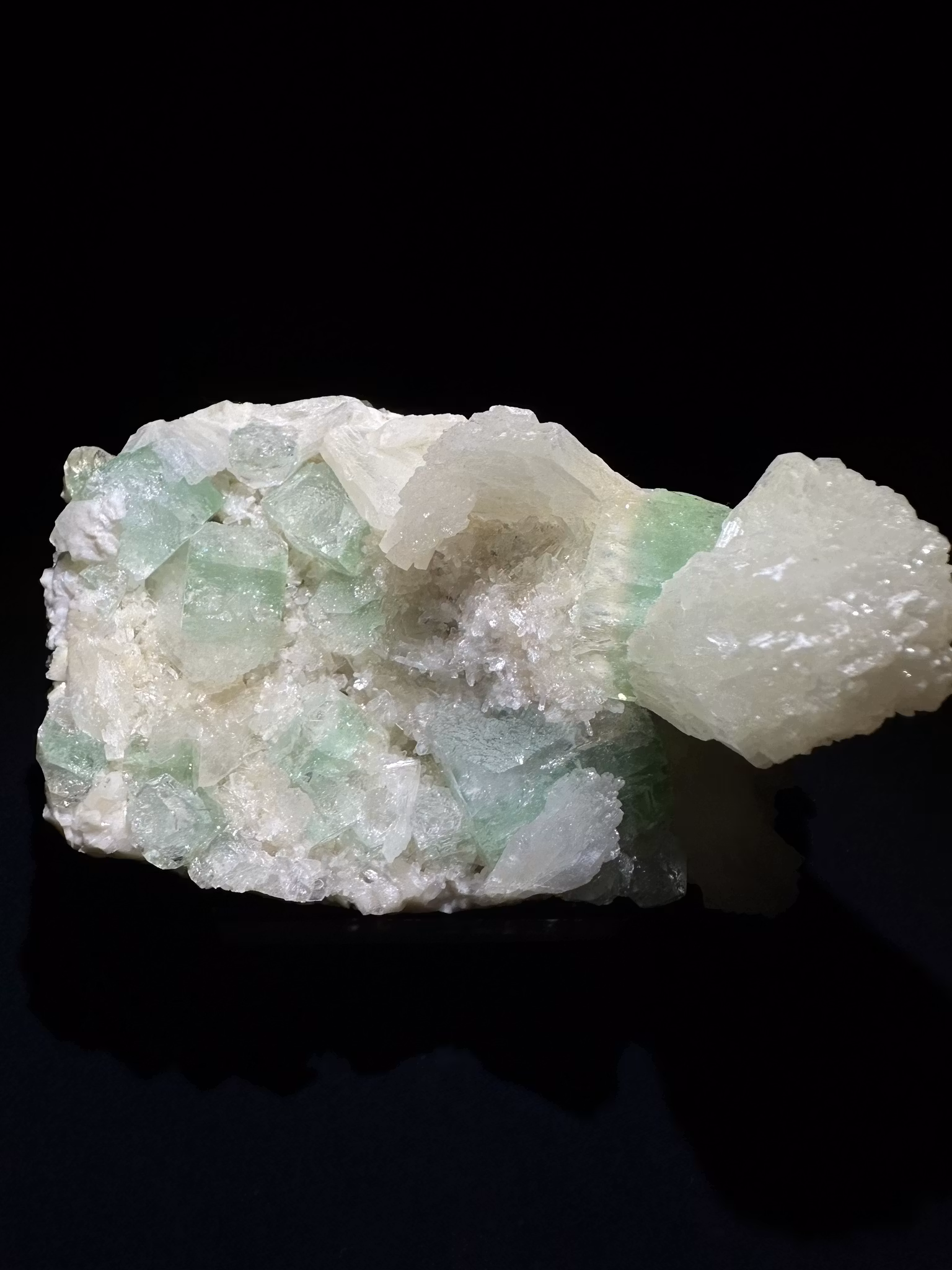 Ett magnifikt kristallkluster med grön apofyllit och stillbit, vars naturliga skönhet och energi gör varje exemplar helt unikt. De ljusgröna apofyllitkristallerna glimmar i ett klart, nästan eteriskt ljus, vackert kontrasterat av den mjuka, pärlemorskimrande stillbiten som omfamnar klustret.