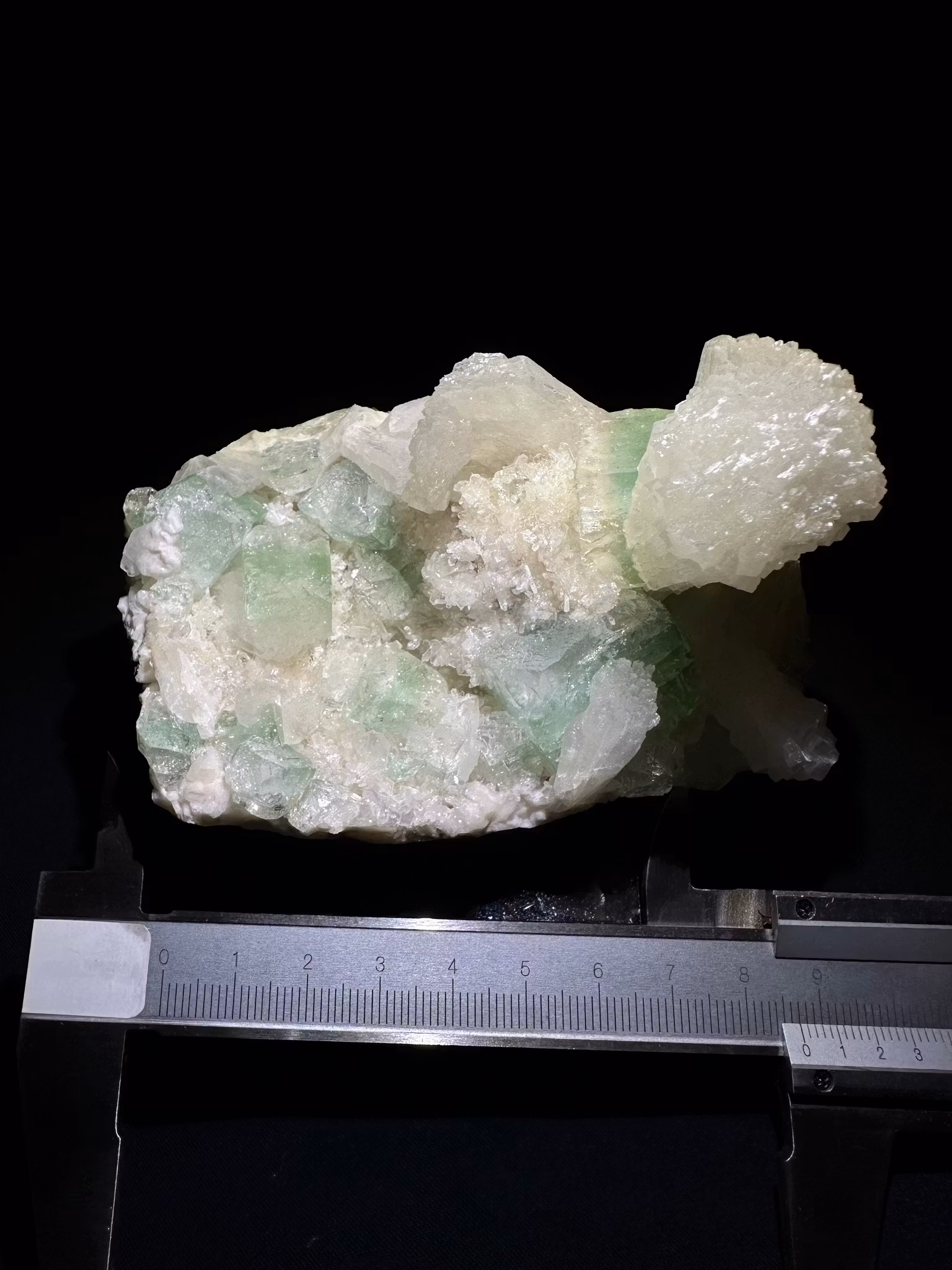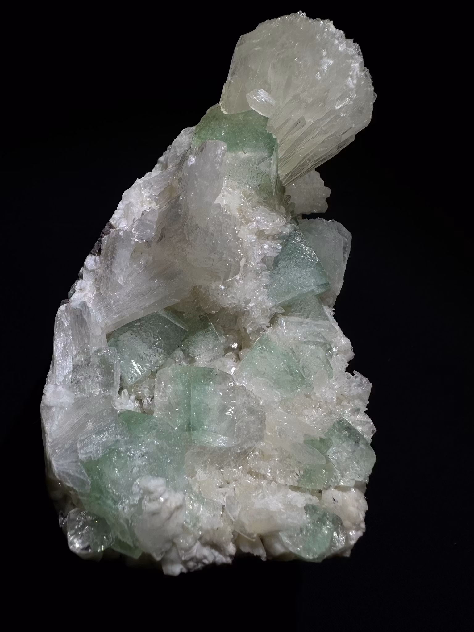 Ett magnifikt kristallkluster med grön apofyllit och stillbit, vars naturliga skönhet och energi gör varje exemplar helt unikt. De ljusgröna apofyllitkristaller
